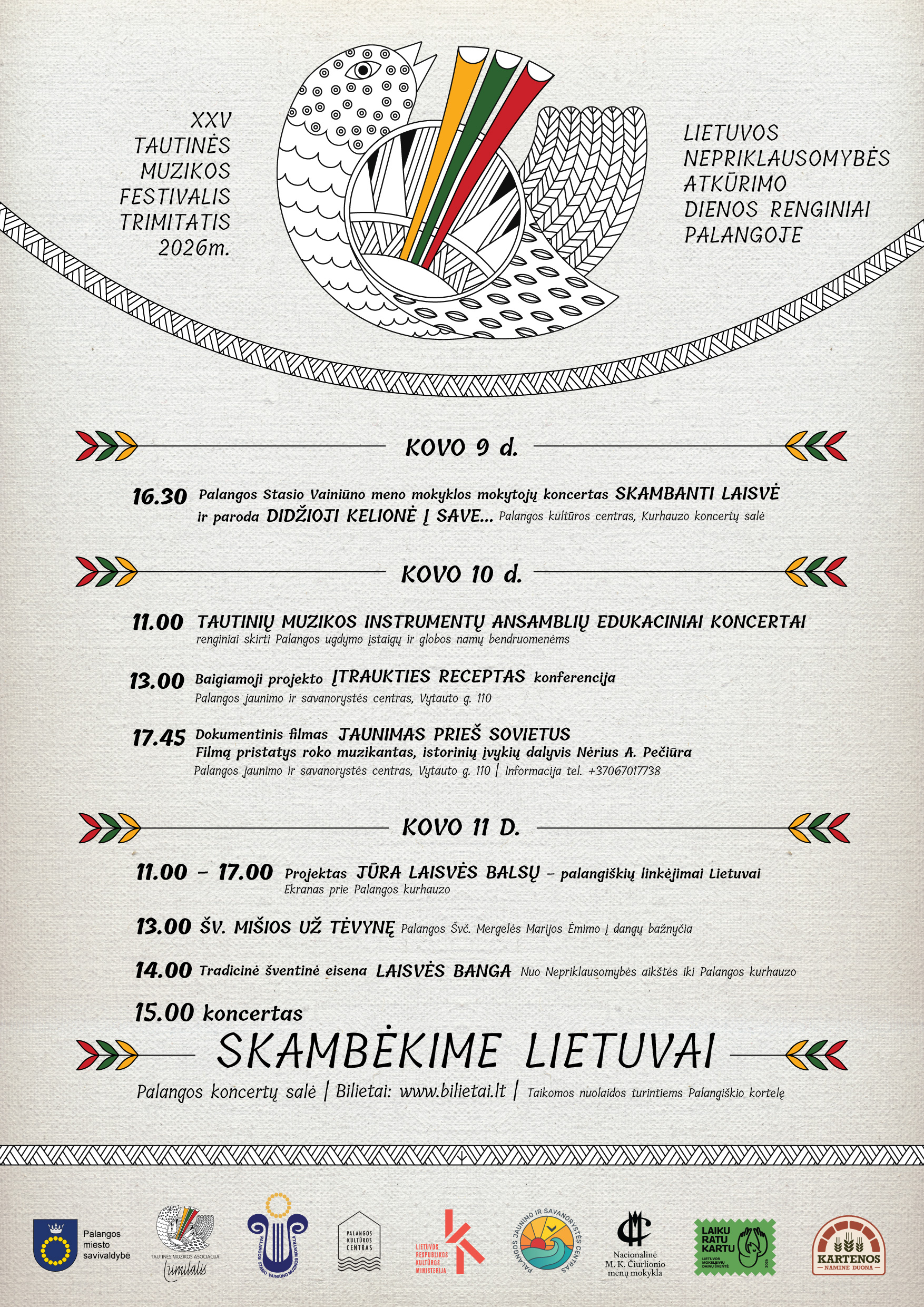 Kovo 10-ąją tautinių muzikos instrumentų ansambliai koncertuos Palangos ugdymo įstaigose ir globos namuose – muzika pasieks mokyklų bei bendruomenių erdves. Tą pačią dieną Palangos jaunimo ir savanorystės centre vyks projekto „Įtraukties receptas“ baigiamoji konferencija, o 17.45 val. bus rodomas dokumentinis filmas „Jaunimas prieš sovietus“, kurį pristatys roko muzikantas, istorinių įvykių dalyvis Nėrius A. Pečiūra.