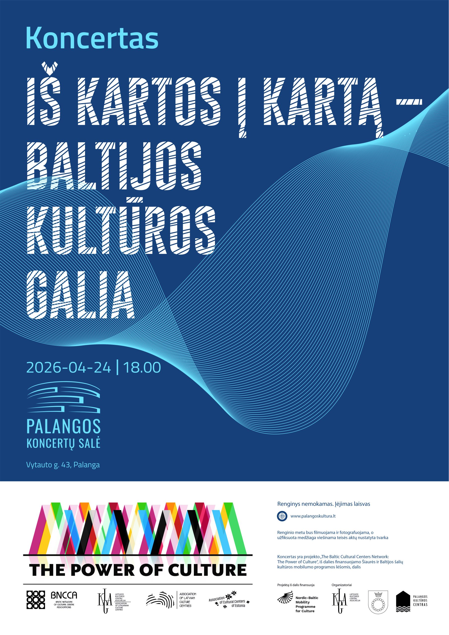 Baigiamajame projekto Baltijos šalių kultūros centrų tinklas (BNCCA) „KULTŪROS GALIA“ („The Baltic Cultural Centers Network: The Power of Culture“) renginyje susitiks gausi Lietuvos kultūros centrų ir palangiškių bendruomenė bei delegacijos iš Latvijos ir Estijos. Šis susitikimas įprasmins trijų Baltijos šalių siekį stiprinti Baltijos šalių kultūros centrų bendradarbiavimą, skatinti profesinių kompetencijų mainus ir plėtoti bendrą kultūros politikos dialogą Baltijos šalių regione.
